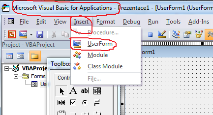 5.Krok - otvoril sa Visual Basic, z karty Insert vyberáme UserForm
